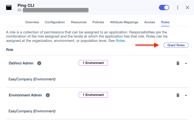Click on the Roles tab, and set administrative roles accordingly. Example roles to be able to manage environments and their configurations are shown in the example screenshot. You can find more information about role permissions in the PingOne Cloud Platform online documentation.
